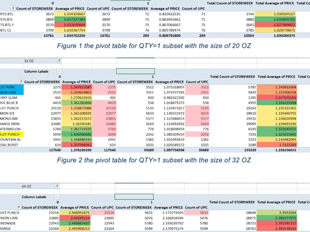 In the first step, we would like to select the raw data for the three brands such that two are of the same price category (high or low), and the third is of the other type. It was essential to make sure the package size (QTY, indicates the size of the bundle) is the same for all three brands. So, we divided the data for high-movement sport drinks into two subsets by QTY=1 and QTY=2. Then, for each subset, we used pivot tables to find average prices for the brands for Feat = 0 and Feat = 1, and total counts of cases. Filtered by the sizes of 20OZ, 32OZ, and 64OZ, the pivot tables for QTY=1 subset are shown in the following figures.