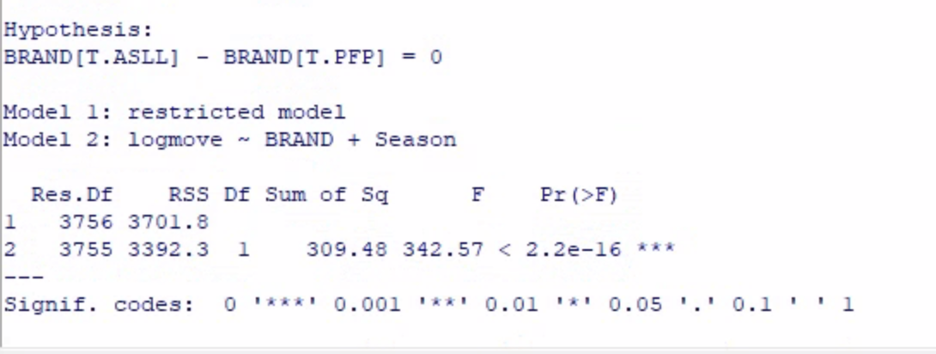 According to the calculations, The price elasticity respectively for ASLL, PFP, and ASFP are -1.925382, -2.981695, -1.925382. Therefore, we conclude that as the price of a brand goes up, the demand drops. The price elasticity is different for each brand.